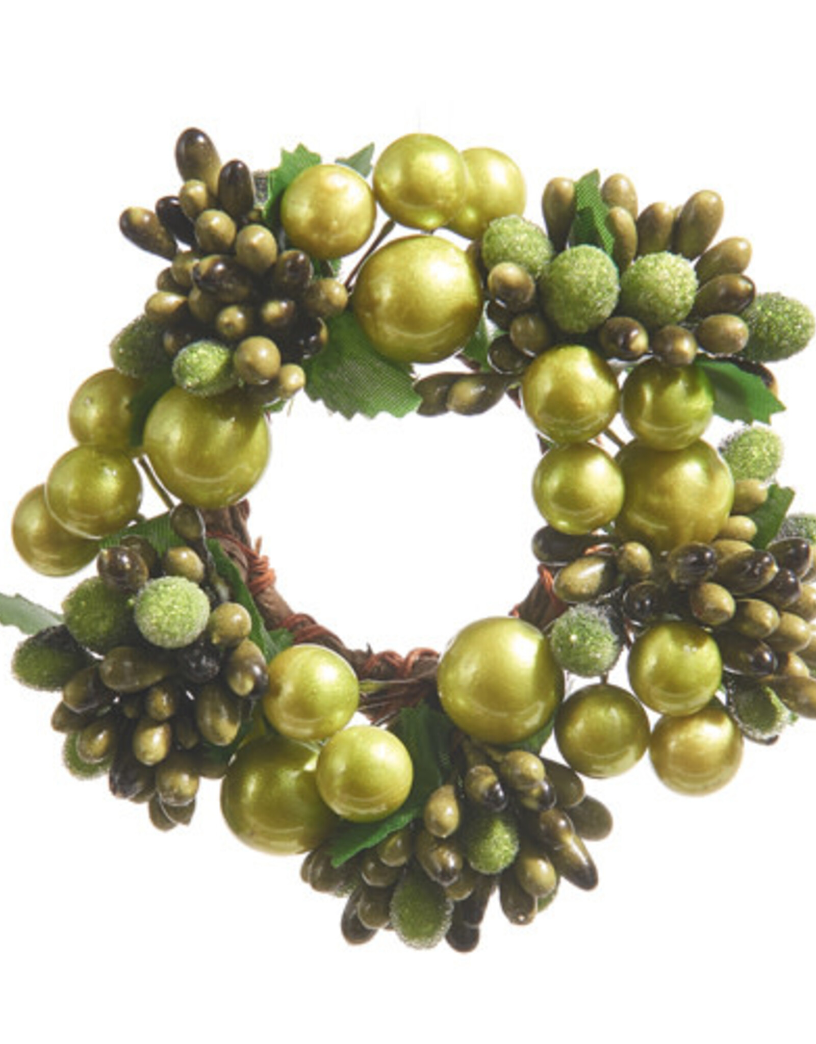 Shades of green are brought together with berries in multiple textures to create a beautiful mini wreath or candle ring. Perfect for tree or table.